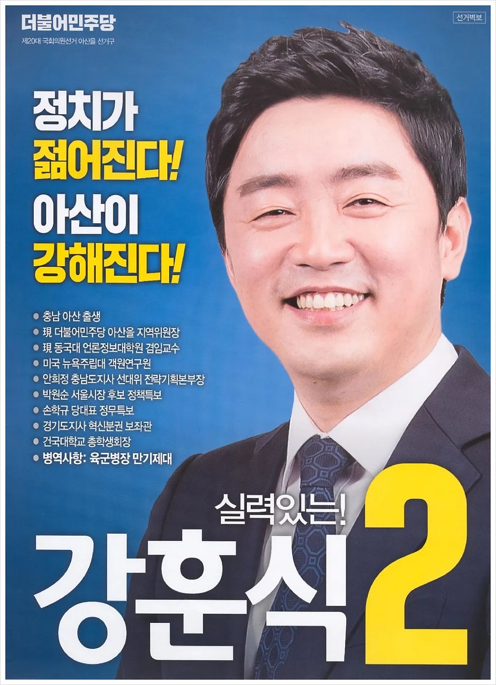 강훈식은 2016년 제20대 총선에서 충남 아산시 을 지역구로 더불어민주당 소속으로 당선되며 국회에 입성했다. 이는 강훈식 경력에서 중요한 전환점이었다. 그러나 선거 과정에서 외자유치 보좌관 경력과 경기도지사 혁신분권 보좌관 근무 기간을 부풀린 혐의로 공직선거법 위반으로 기소되어 2017년 벌금 80만원을 선고받았다. 이 논란은 그의 정치적 신뢰에 잠시 영향을 미쳤으나, 이후 지역구 관리와 정책 활동으로 이를 극복했다.