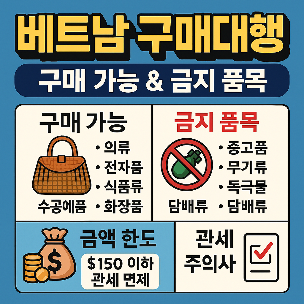 베트남 구매대행을 통해 다양한 현지 상품을 국내에서 손쉽게 구매할 수 있습니다. 그러나 구매 전 해당 품목이 수입이 가능한지, 관세 및 세금이 부과되는지 등을 반드시 확인하시기 바랍니다. 또한, 신뢰할 수 있는 구매대행 업체를 통해 안전하고 합법적인 거래를 진행하시기를 권장드립니다.
