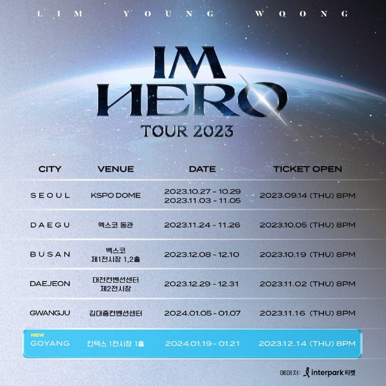 2023년에는 'IM HERO TOUR'라는 이름으로 여러 도시에서 공연을 했어요. 서울, 대구, 부산, 대전, 광주 등 다양한 도시에서 팬들과 만났죠. 각 도시의 공연 일정은 다음과 같아요.